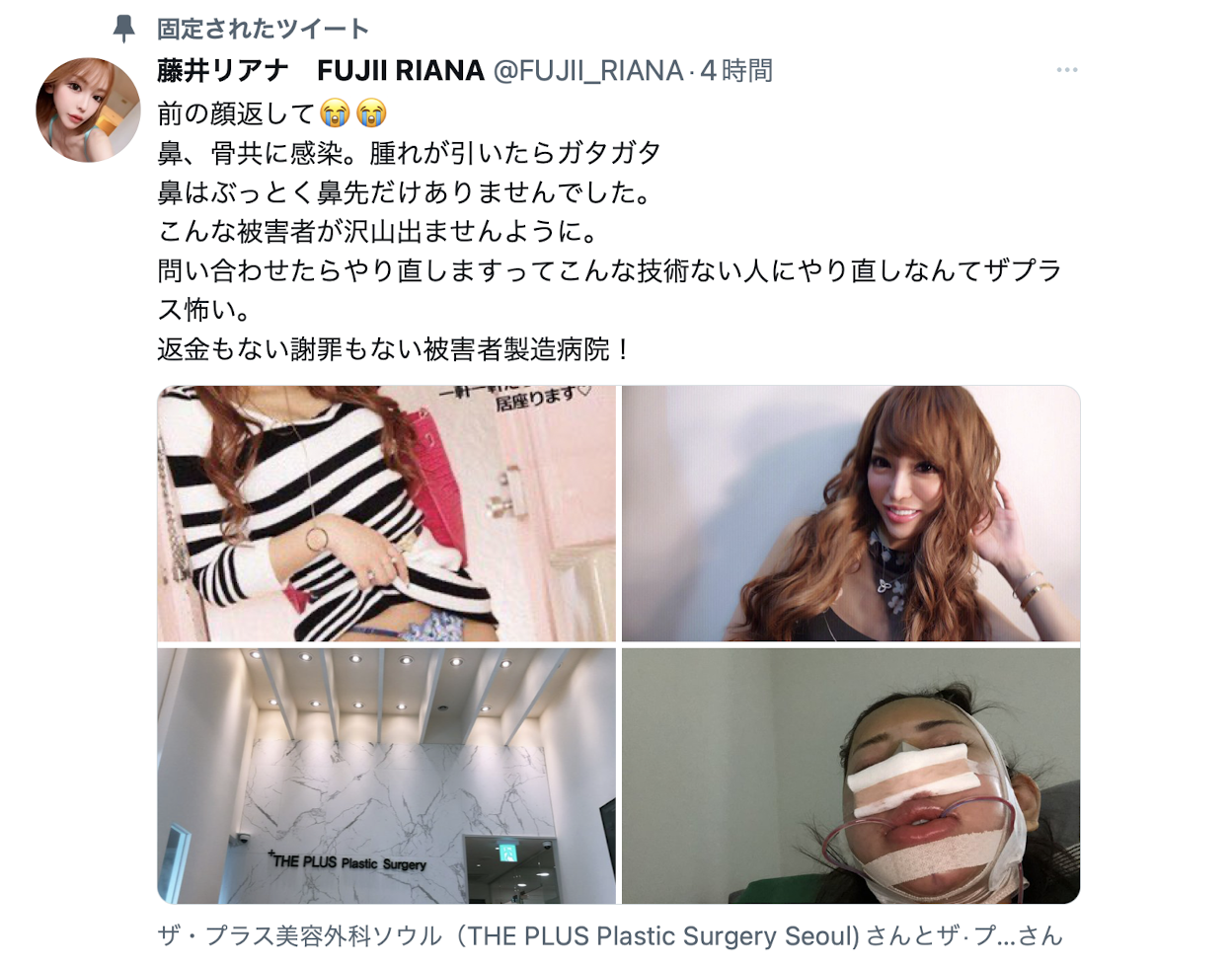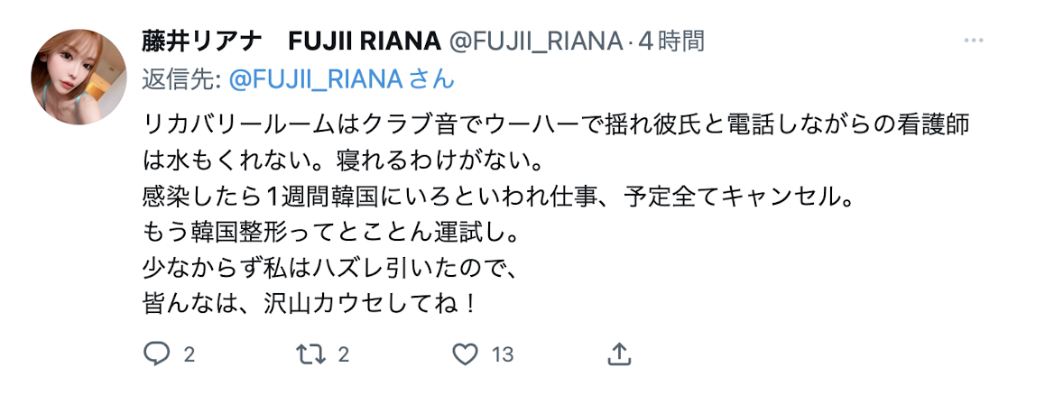 很惨,真的很惨,不只被整坏了,藤井リアナ(藤井梨亚奈)还抱怨诊所的环境很差,在病房竟然可以感受到有如夜店般的电子乐震动感;然后因為感染,她被要求留下来追踪观察,就这样来不及回去日本(对,她去韩国整形,其实蛮多女优去韩国都是这档事),身体不舒服加上原本预定好的工作因為行程延误而取消,再加上护士没有给水喝,她只能打电话和男朋友抱怨并且直呼到韩国整形根本就是碰运气,而她抽到了下下籤〜